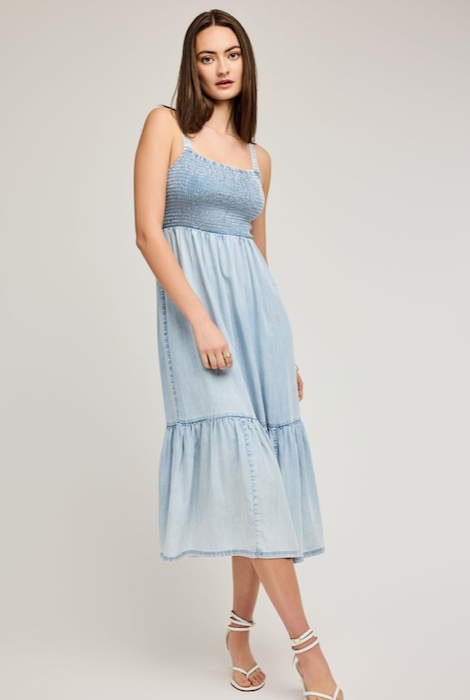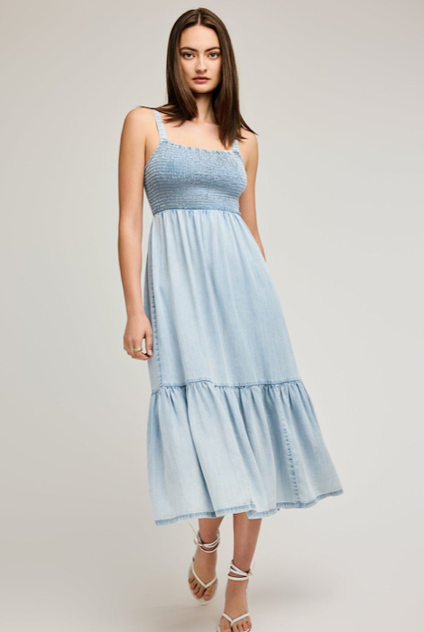 The Nova dress is made of Tencel fabric that has been specially washed to achieve a dimensional look and soft feel. Features include adjustable straps and a smocked bodice.