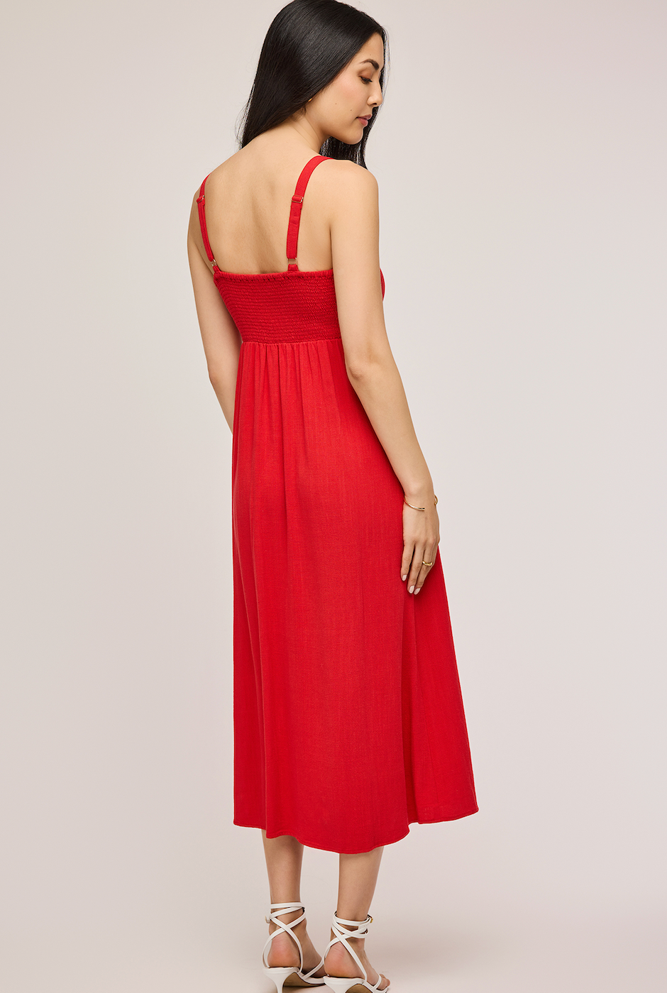 The Cairo dress is made of a linen blend fabric for an effortless look and feel. Features include an adjustable front tie detail, strap adjusters, and back smocking panel for ease of wear.