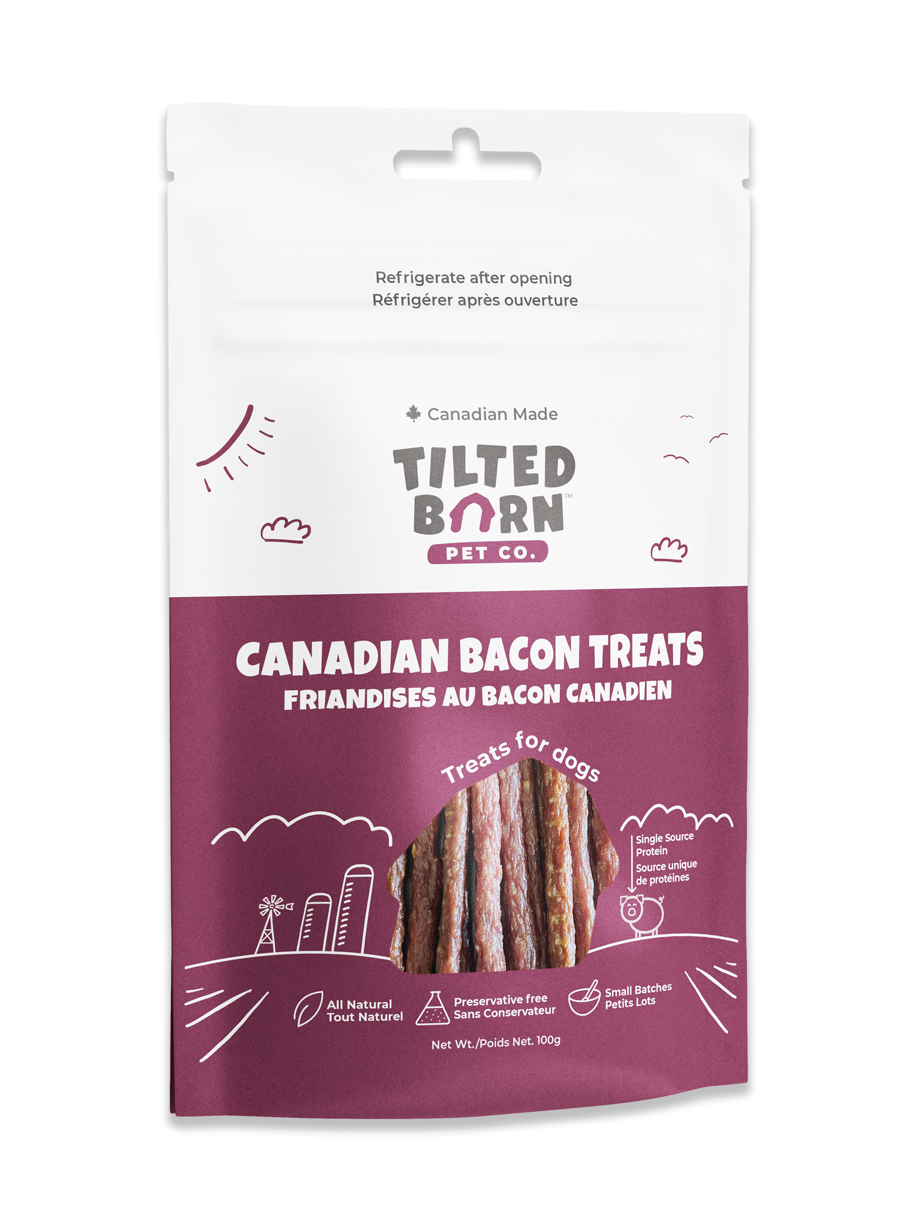 Tilted Barn Pet Treats are healthy, soft meaty treats for dogs and cats.These treats are preservative-free and contain no fillers or by-products. These single-source protein treats are made with all-natural, high-quality, whole ingredients from the human food market sourced from across the Canadian Prairies, and are 100% Canadian-made. The Canadian Bacon Treats Recipe is made with ground pork, pork liver, heart and kidneys, oatmeal, liquid honey, a small amount of brown sugar to bind the treats together, garlic, and sea salt. (100g/pack)