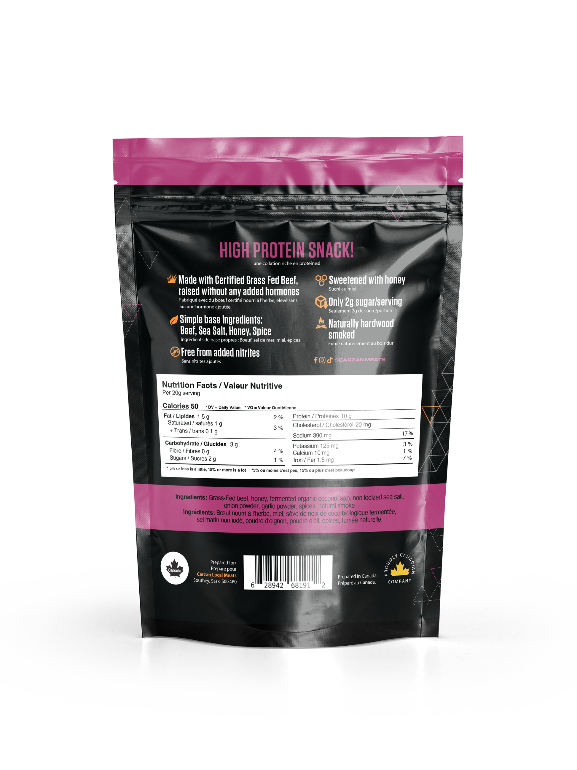 Introducing our Ginger Beef Jerky – a tantalizing fusion of savoury and mild ginger warmth! Crafted with care, each delectable strip boasts the bold flavour of premium Grass Fed beef kissed with the unmistakable warmth of ginger. It's a flavour symphony that dances on your palate, offering a unique twist on traditional jerky. So, whether you're a seasoned spice enthusiast or just looking to tickle your taste buds with something new, our Ginger Beef Jerky is sure to leave you craving more. Grass-Fed Beef Sweetened with Honey No added Nitrites Low Sugar Made with simple ingredients you CAN Pronounce!