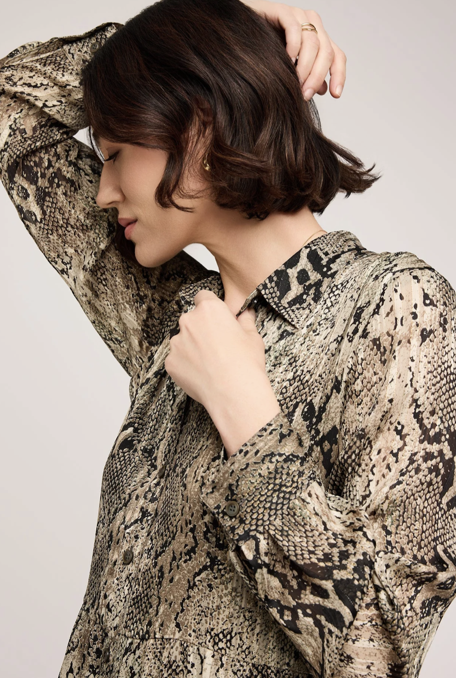 The Gentle Fawn Vesper Dress in Jade Snake balances bold print with elegant ease. Made from lurex-stripe chiffon with an in-house snake motif, it features a mini length silhouette, body lining for coverage, and a functional button-front closure. Lightweight and eye-catching, it’s perfect worn solo or layered under jackets for day-to-night styling.