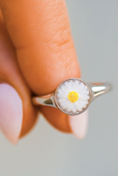 Take the flower field with you wearing our new Meadow Signet Ring! This polished silver signet band features a dried daisy resin pendant that can be stacked or worn by itself to stand out.