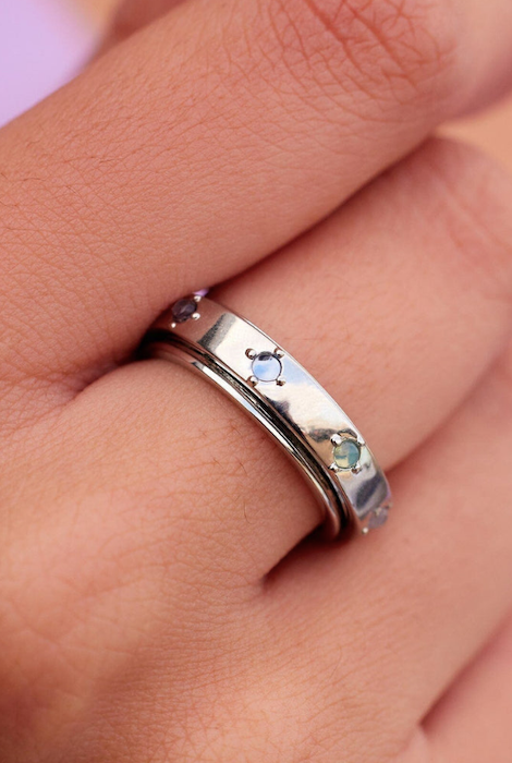 Put your mind at ease and give off super-chill vibes with our Mental Health Awareness Fidget Ring. This rotating ring lets you spin the band to alleviate anxiety, and features an array of gorgeous gemstones to heal your spirit: