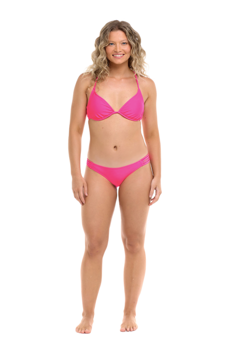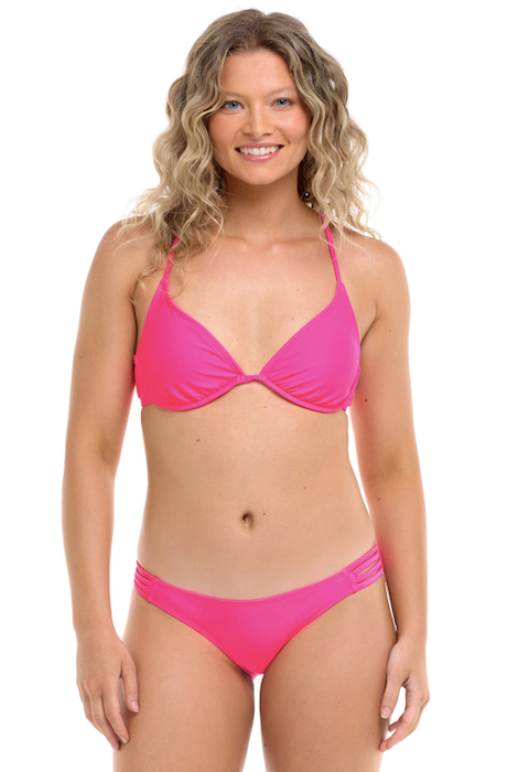 Introducing Patsy, the ultimate underwire top for all your beach adventures! This must-have bikini top features removable soft cups for customizable comfort and support. The two-way tie back ensures a secure fit while adding a flirty touch to your swimwear style.