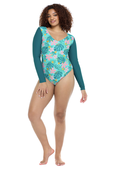 The Chloe one-piece swimsuit is so stylish, it’ll make you want to throw on a pair of high-waisted jeans and head straight to dinner. Chloe is essentially a water-friendly bodysuit, featuring long sleeves, an open back, a sloping v-neckline, and flatlock seams. Its UPF 50 recycled fabric protect against the sun’s rays, and mid coverage around back makes this silhouette perfect for everyone.