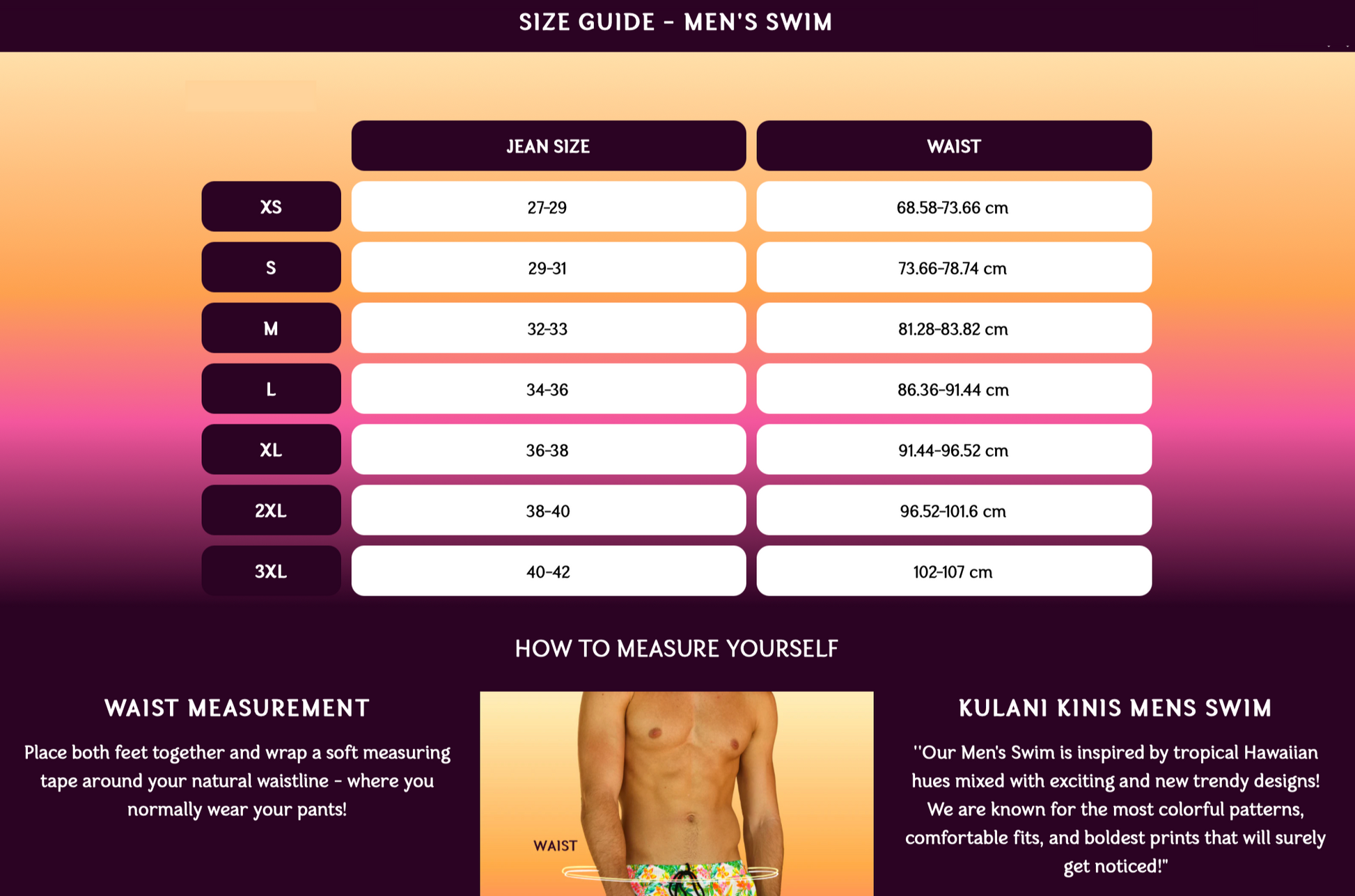 Nic is wearing a size M in these swim trunks and has the below measurements: