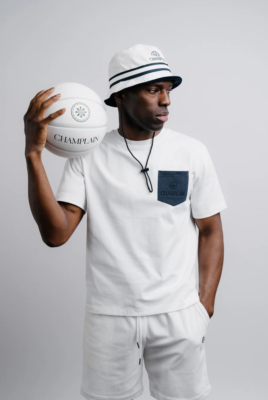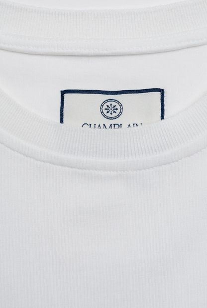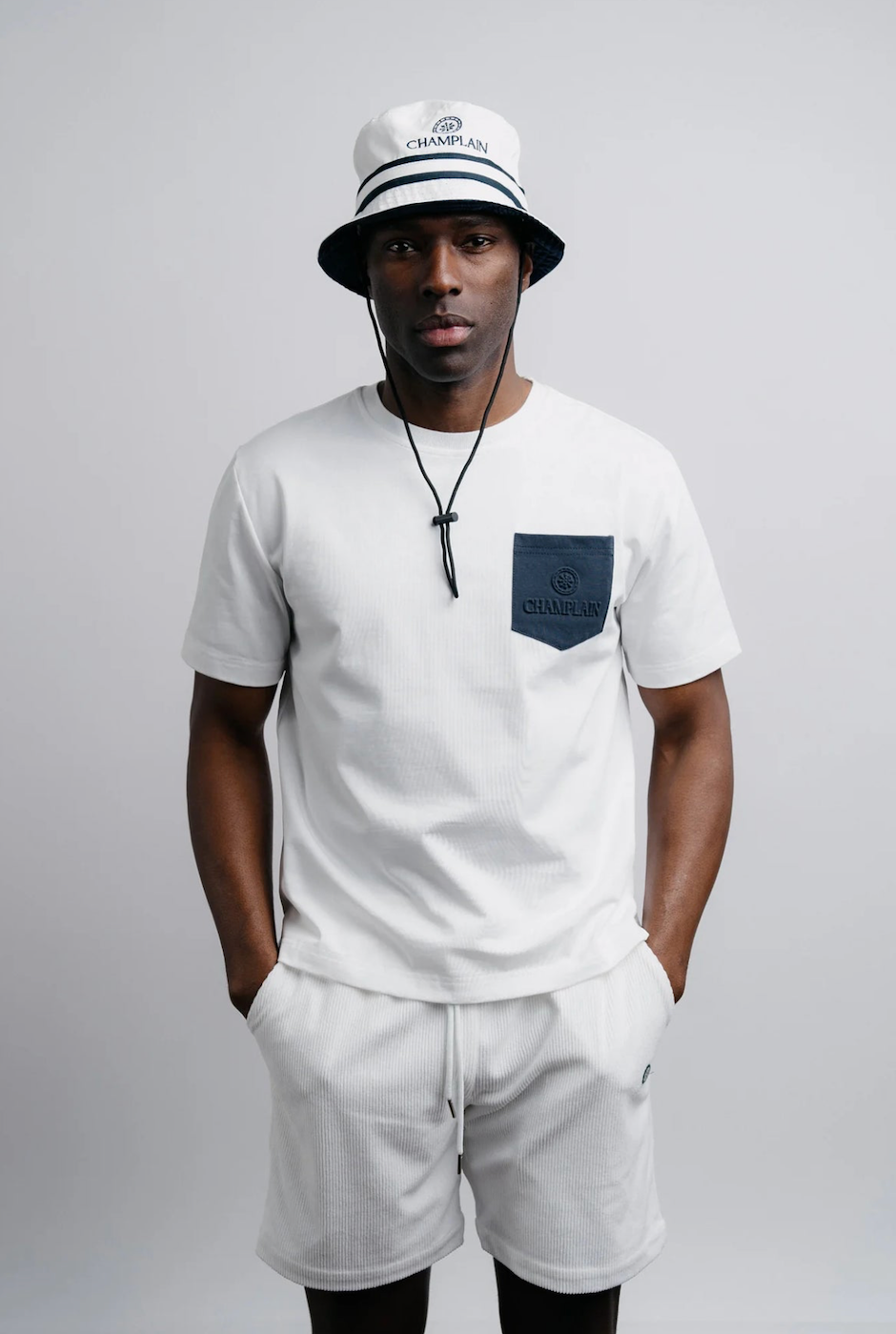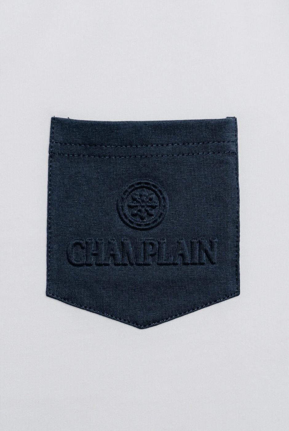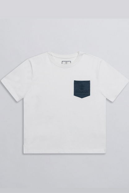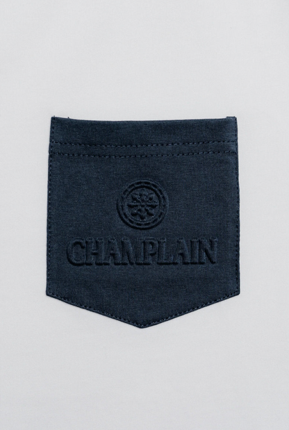 A two toned remodel of a classic pocket tee, with embossed name and logo, this thick-structured material tee remains a staple in a timeless wardrobe.