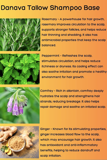 - Herbal-Infused Tallow (Peppermint, Comfrey, Rosemary, Ginger) – Stimulates the scalp, promotes circulation for hair growth, and strengthens fragile strands.