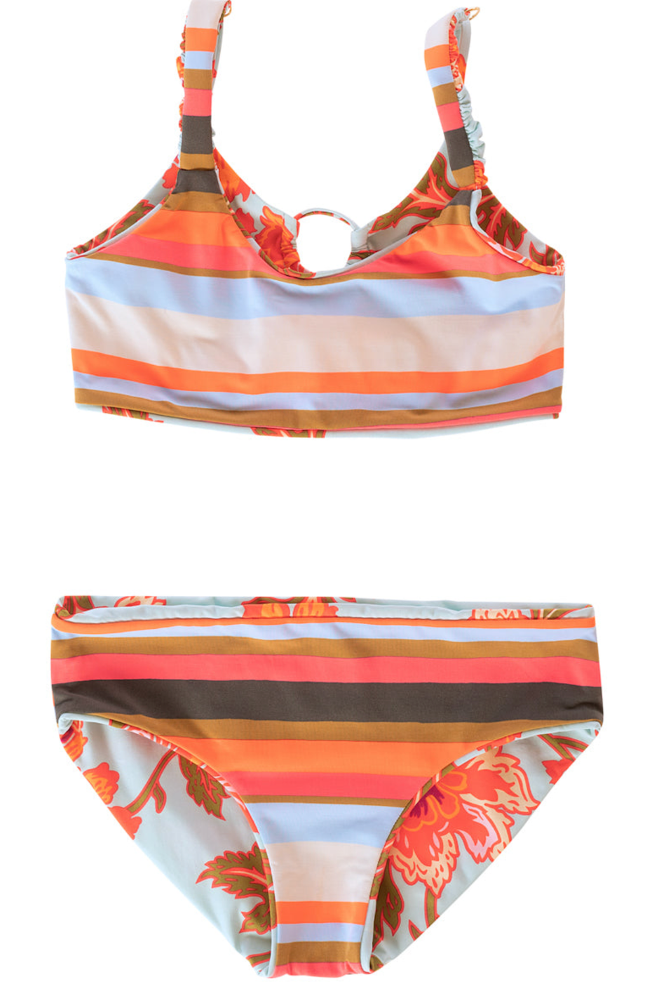 If you love aqua blue but also love flowers, you'll love the Juliet bikini set. With lots of coverage, a fun criss-crossing strappy back, and reversible print, the Juliet is a great choice for your playing on the sand.