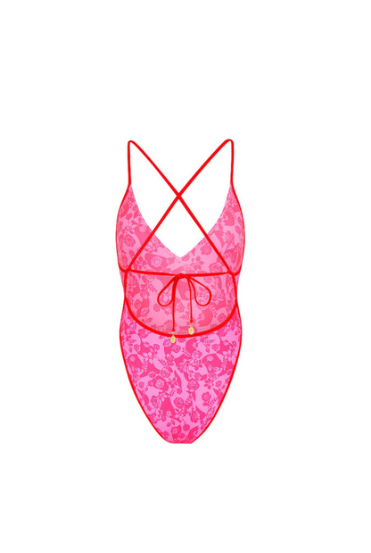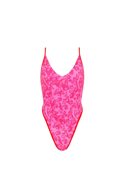 Turn heads and make waves in the Plunge Cross Back One Piece in Hearts Collide. With a daring deep-V front, low back, and soft contrast trim, this suit is equal parts flirty and functional. Criss-cross straps give you adjustable support so you can splash, sun, or strut with confidence.