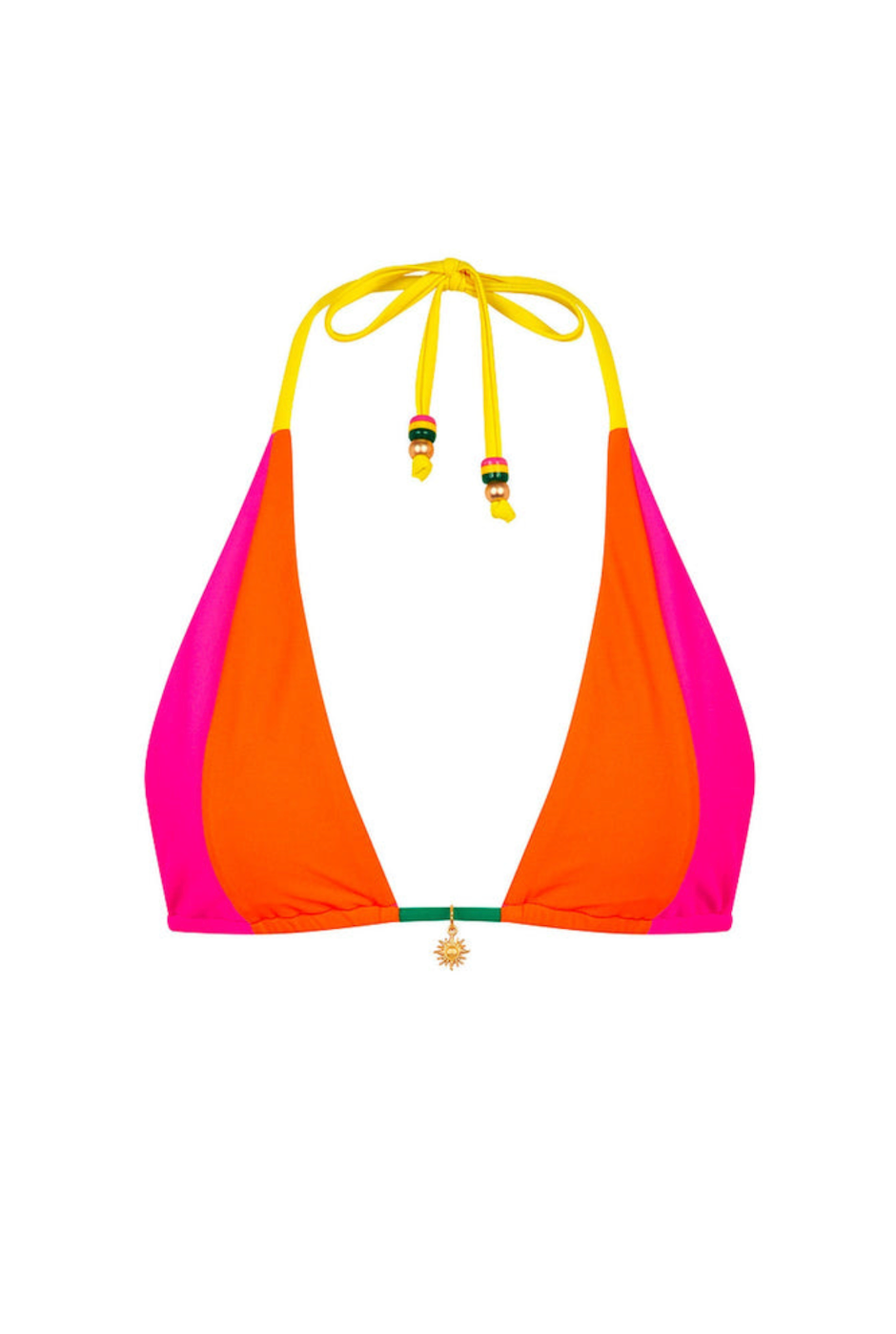 Turn up the heat with the Splice Triangle Bikini Top in Passionfruit Punch – a vibrant twist on a classic fave. With contrast binding and adjustable ties, this piece serves up playful color blocking and serious swim energy. Designed for mixing, matching, and making waves.