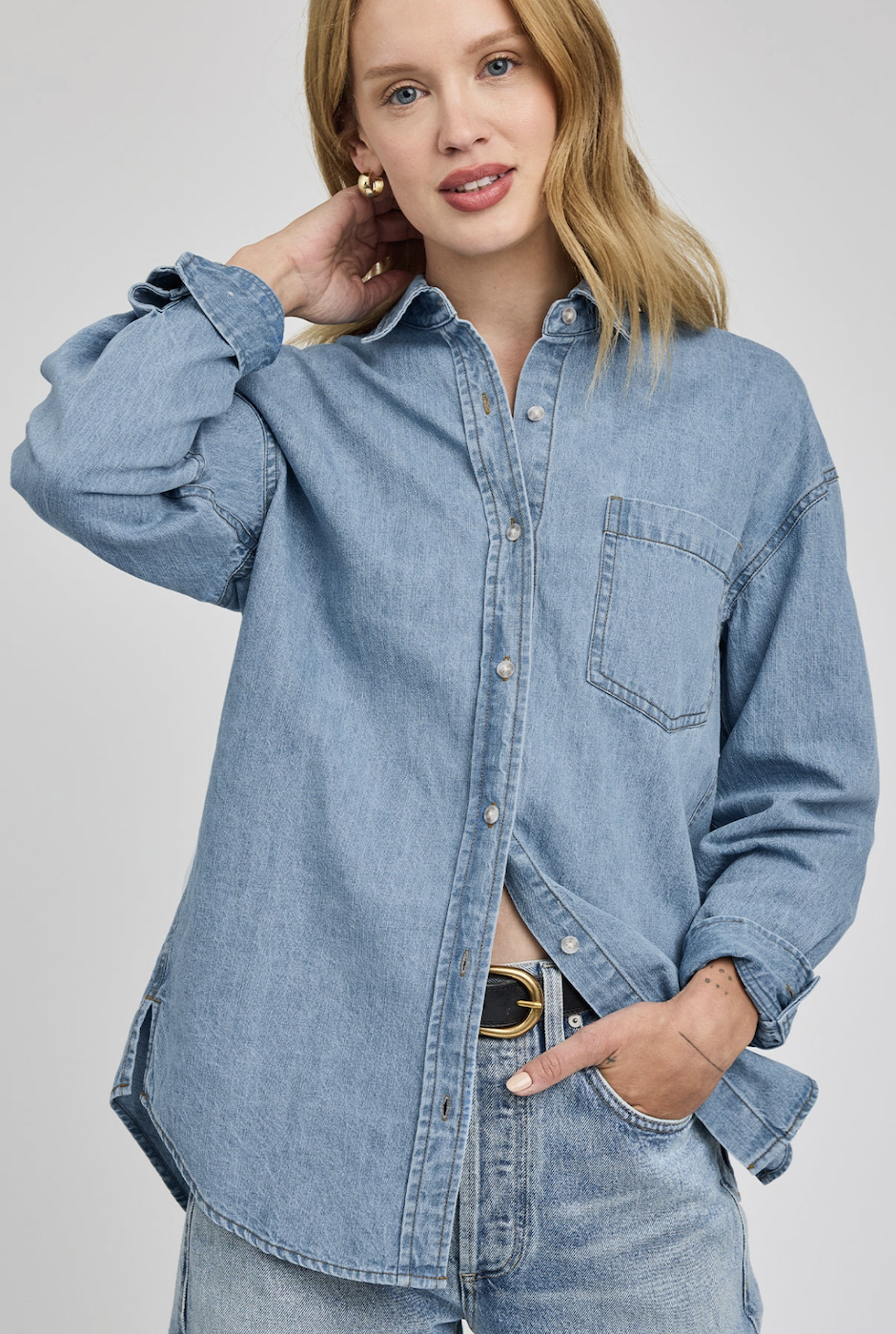 The Gentle Fawn Whitney Denim Button Down Shirt is an effortless wardrobe staple with a relaxed, lived-in feel. Crafted from a soft cotton-linen denim blend, this lightweight shirt has been specially washed for that perfectly worn-in look. Designed with a classic button front, patch pocket, and side slits for easy movement, it’s the ideal layering piece to wear open over tanks, buttoned with trousers, or styled with matching denim for a modern take on the Canadian tuxedo. Available in Light Wash and Dark Wash.