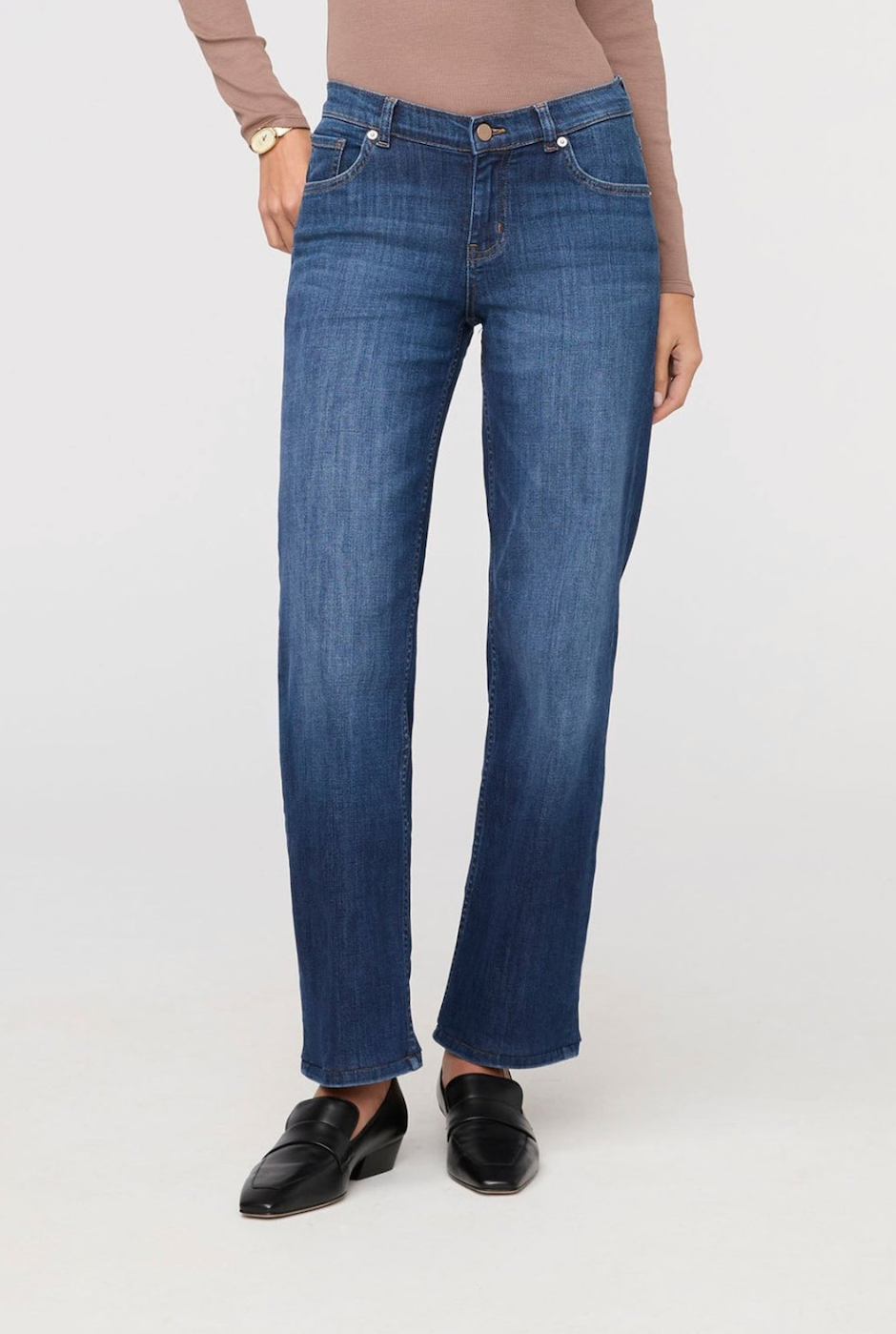 - Mid rise, easy fit through the hip and thigh and hits at the mid calf